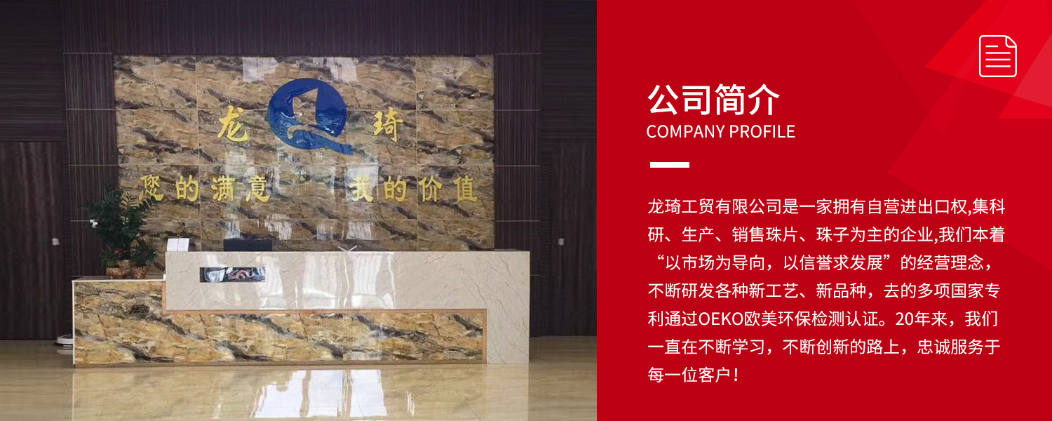 龍琦工貿(mào)有限公司是一家擁有自營(yíng)進(jìn)出口權(quán),集科研、生產(chǎn)、銷(xiāo)售珠片、珠子為主的企業(yè)。